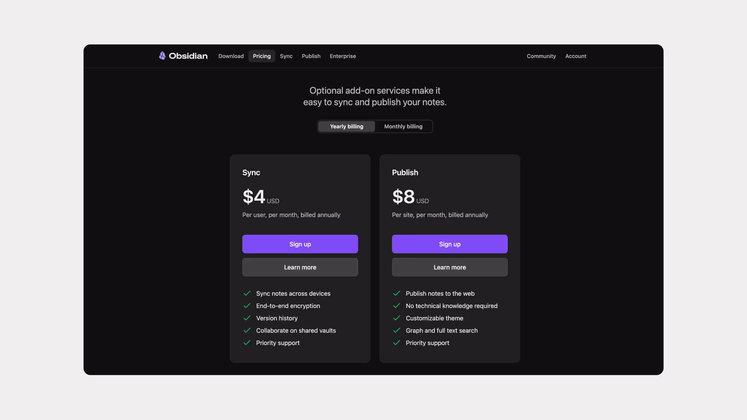 - Obsidian Sync Standard: $4/user/month (billed annually) for syncing across devices