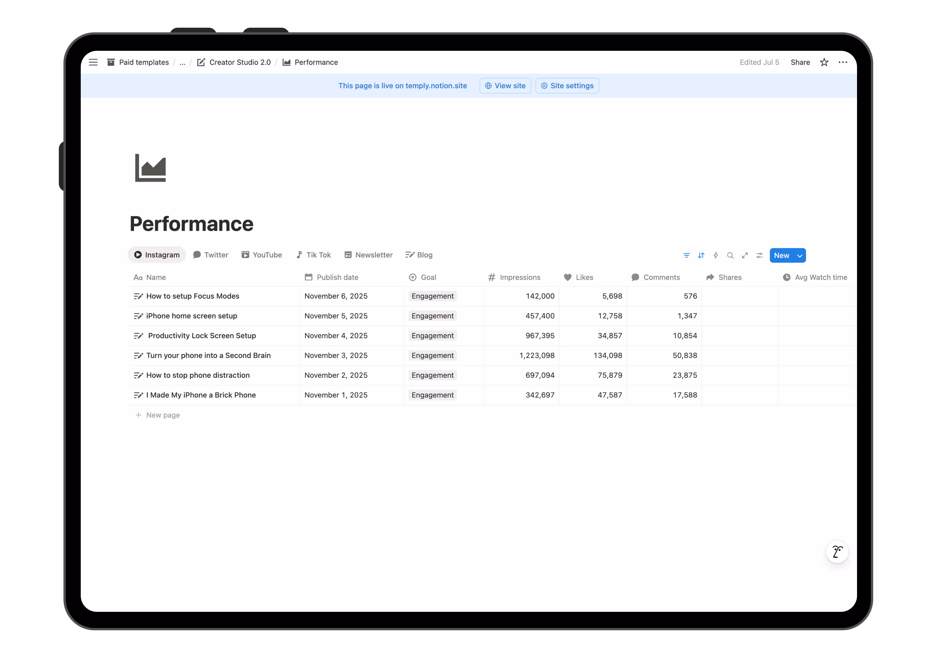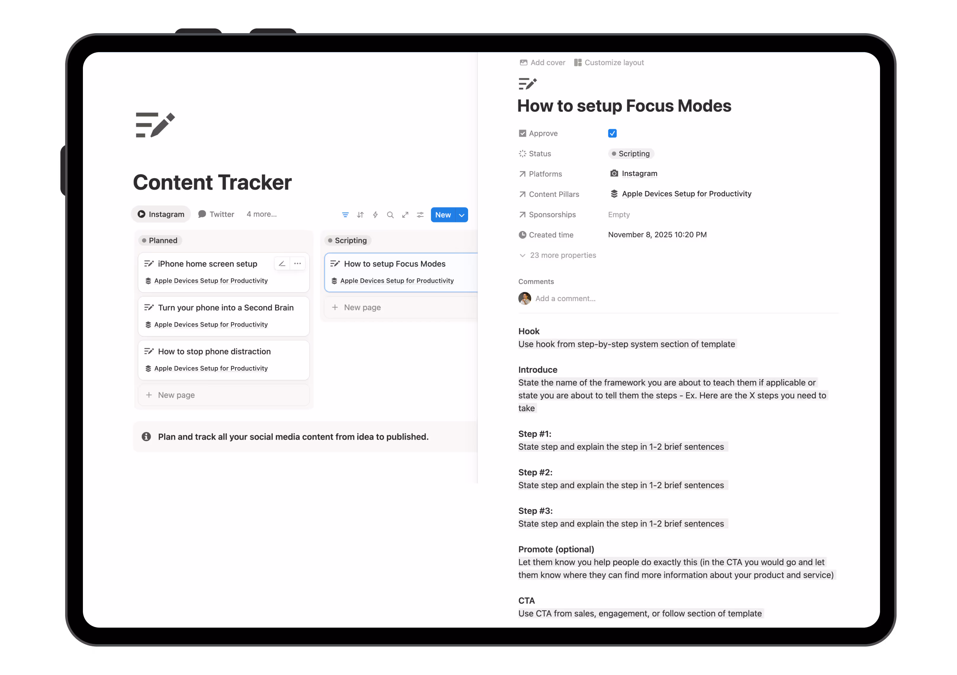 Notion Creator Studio is a proven formula that hundreds of creators use to publish consistently without guessing what to create. It helps you define content pillars, organize viral ideas, plan months in advance, and track what actually grows your audience.